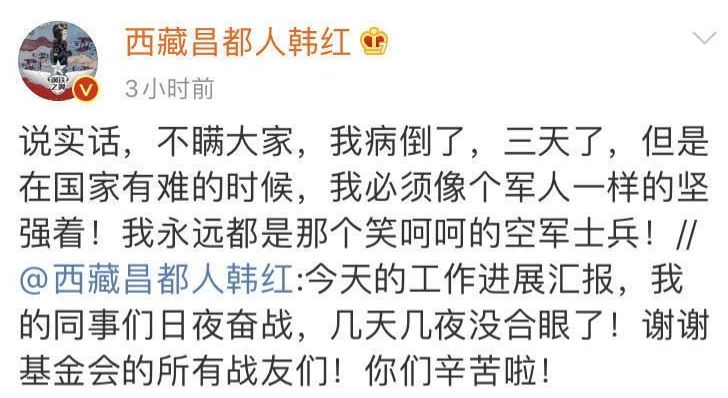 从疫情爆发的时候,韩红就开始组织筹款。