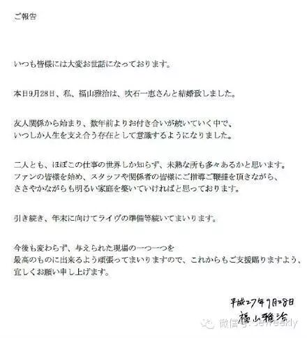 今天是吹石一惠的生日,福山雅治特意挑选这样特别的日子对媒体宣布消息,简直不能更甜蜜!!!下面是福山叔的结婚报告,“意识到是支撑彼此人生的重要存在”,这表白力简直不能更高!