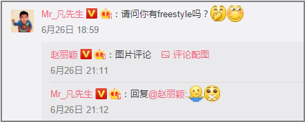 吴亦凡也发挥了娱乐精神,在评论里对赵丽颖发出灵魂拷问:你有Freestyle吗?被赵丽颖一张图片怼了回去...