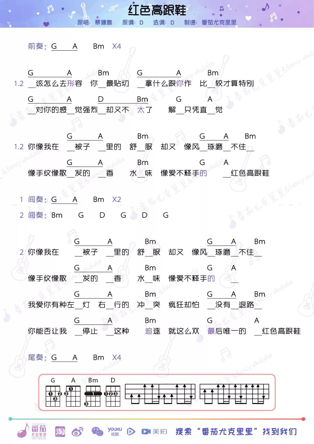 这是一首蔡健雅轻快风的代表作,非常适合小女生演唱,自由自在的妳只需要一把尤克里里。
