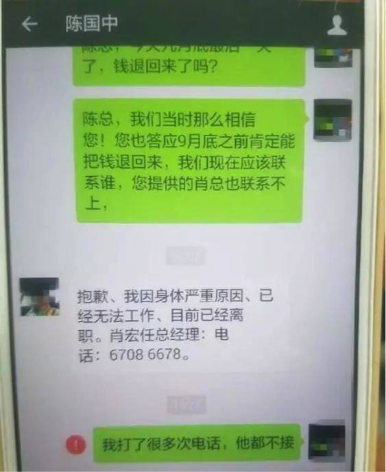 目前,陈国忠的电话已无人接听。出人意料的是,现企业法定代表人代表肖宏跟媒体称自己是受害者。肖宏称,7月份被通知出任法人代表时,他了解到当时公司经营状况不佳,但是陈国忠给出了发展方案和计划,并称身体不好,需要他帮忙。在完成了更换法人代表手续后,他曾多次向陈国忠协调发放员工工资的事宜,“他一开始总说过几天就发,结果一直拖到29号公司关门。之后再联系他,竟说让我自己看着办。”