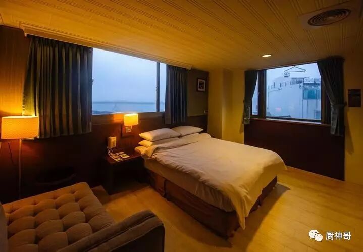 澎湖和田大饭店,这是一家很有特色的旅馆,就在码头边上,离市里的景点和鱼市场都可以步行到达。房间面积不小,海景房的视野相当完美,可以坐在床上看大海。
