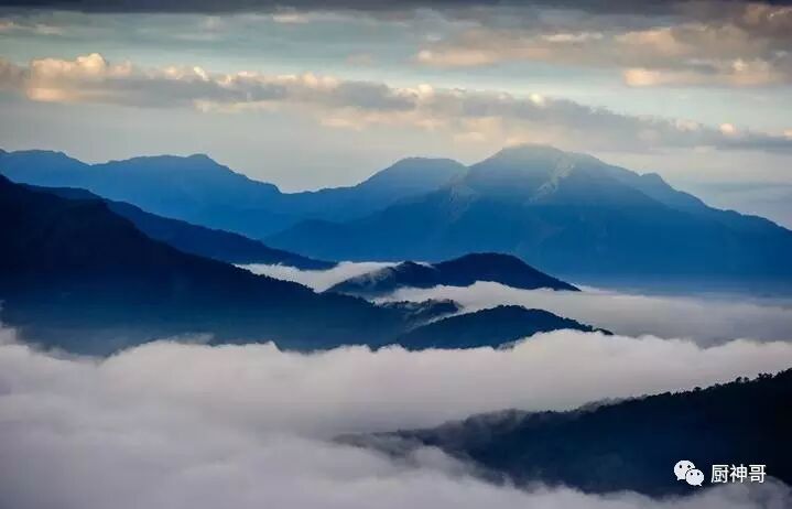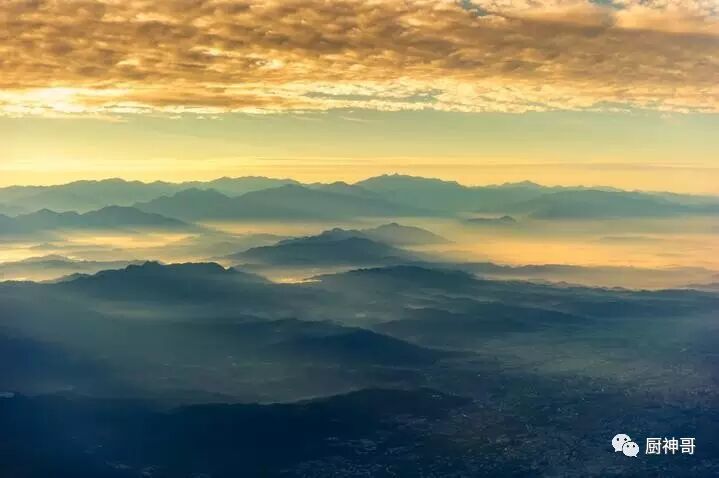 飞机上看到的风景,晨雾下台湾的群山,如同海中连绵的波涛。