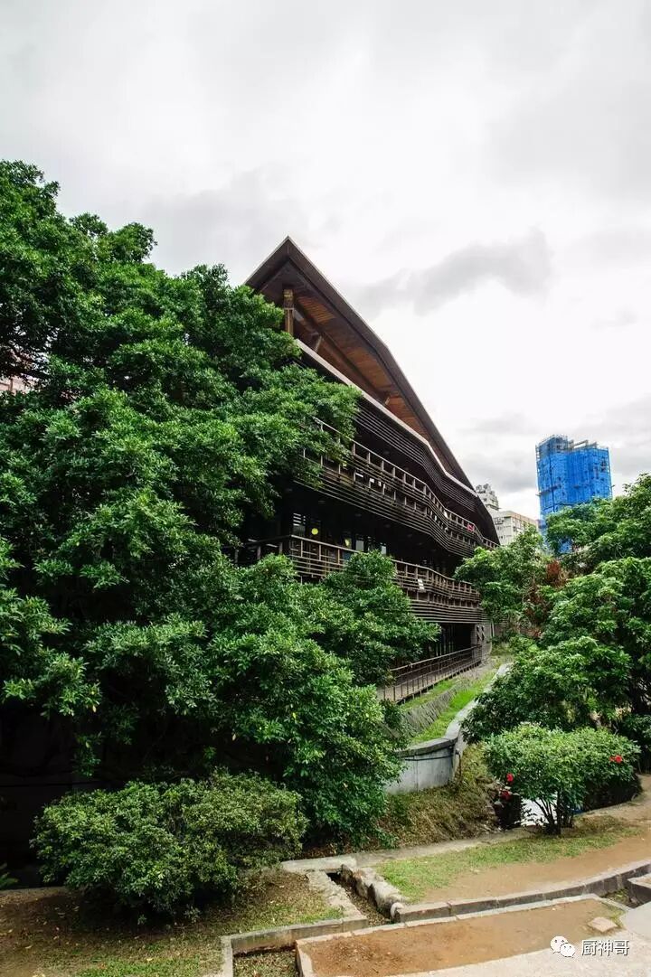 这座像苍翠林木中的木制大船一样的图书馆是台湾第一座“绿建筑”图书馆,地下一层,地上两层,以自然环保的建筑方式建成。据说为了在夏季降低馆内温度,节约电力的使用,馆内采用了高低窗设计产生对流,降温且利于空气流通。图书馆的主要能源来自于太阳能,屋顶的草皮也采用了特殊的设计,可以储存雨水,用来浇灌馆内的绿植和洗手间的用水。