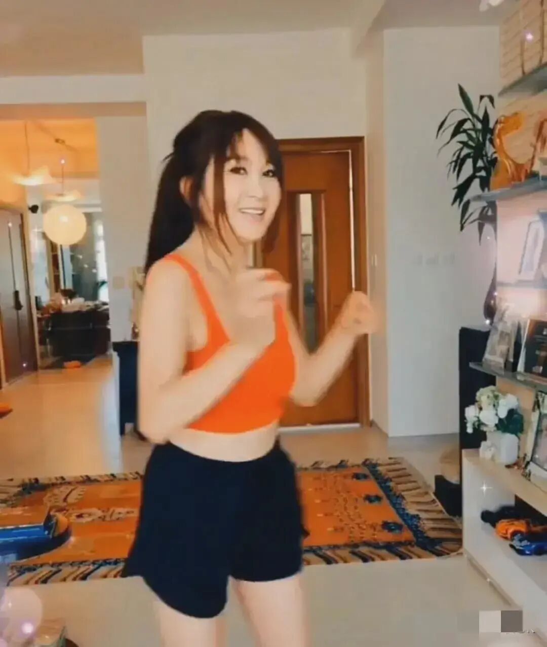 从这张照片中,她整个人穿的这一套运动风的穿搭也可见她也在坚持做运动健身来维持自己的身材。照片中她穿着这一件橙色背心,虽然是露出了她的身材,但是还是能够发现她脸上的皱纹其实还是蛮多的,皮肤状态也是很憔悴。