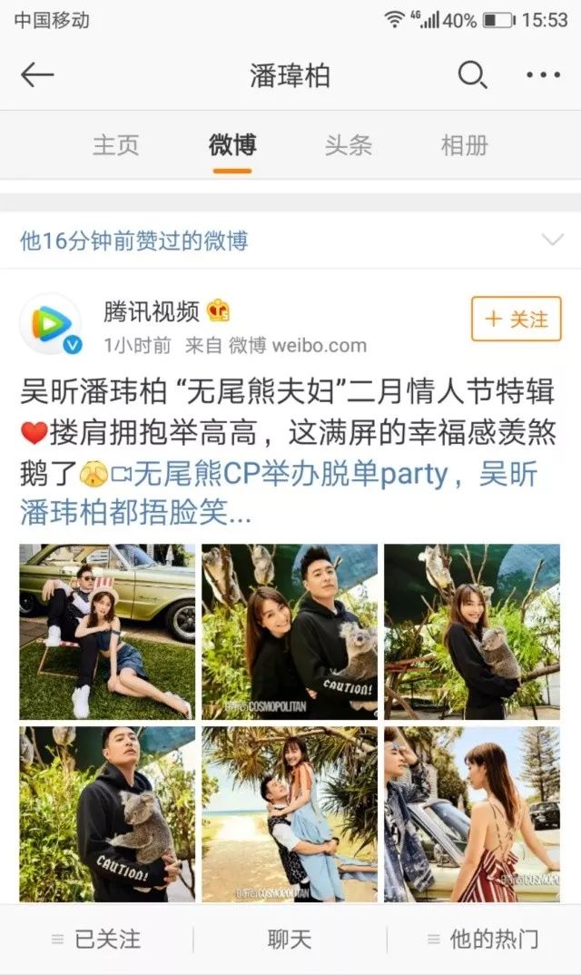 并且这条微博的视频链接里是吴昕潘玮柏在《我们相爱吧》里的“脱单仪式”,啧啧啧,潘帅你点赞这样一条微博,我们才不相信这是因为你手滑...
