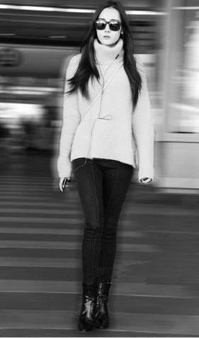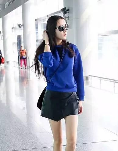 蓝色上衣+不规则黑色裙装,搭配黑色包包!不得不说,她真的很会利用自己大长腿的优势!