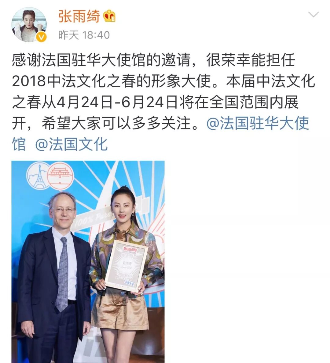 近期,2018中法文化之春全国发布会在京举行。中国演员张雨绮受法国大使馆邀请担任中法文化之春形象大使。