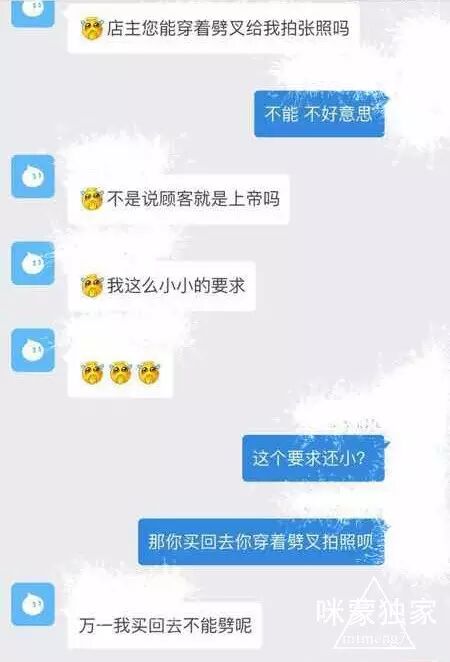 我前几天在网上看到一个淘宝店主跟奇葩买家的对话,笑惨了。