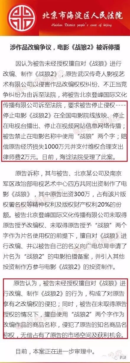 除了预告片抄袭,另一件事是《战狼2》被曝侵权了。