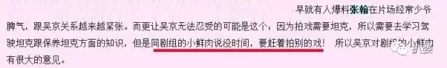 在4月份张翰还没进组的时候,吴京就公开称某小鲜肉不愿意配合体验生活让自己很愤怒。