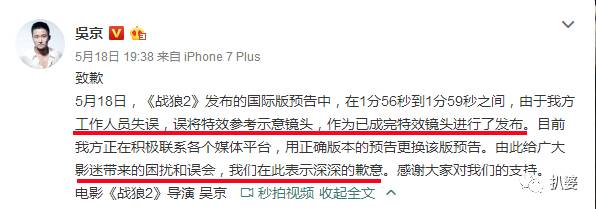 第二,吴京的道歉居然是给广大影迷的,还感谢了大家的支持。