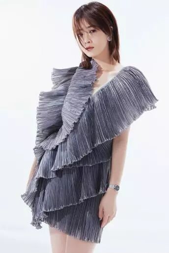 这款灰色礼服裙就超级适合蒋欣的身材,款式上,不对称的斜肩设计让她的宽肩变窄了,视觉上立马瘦了5斤,再加上蛋糕裙的层层裙摆和褶皱的材质特点,让她的腰身也得到了修饰,看起来腰线和腹部都模糊了,而飘动的荷叶边还能时不时遮盖一下她的手臂线条,让双臂更显瘦。