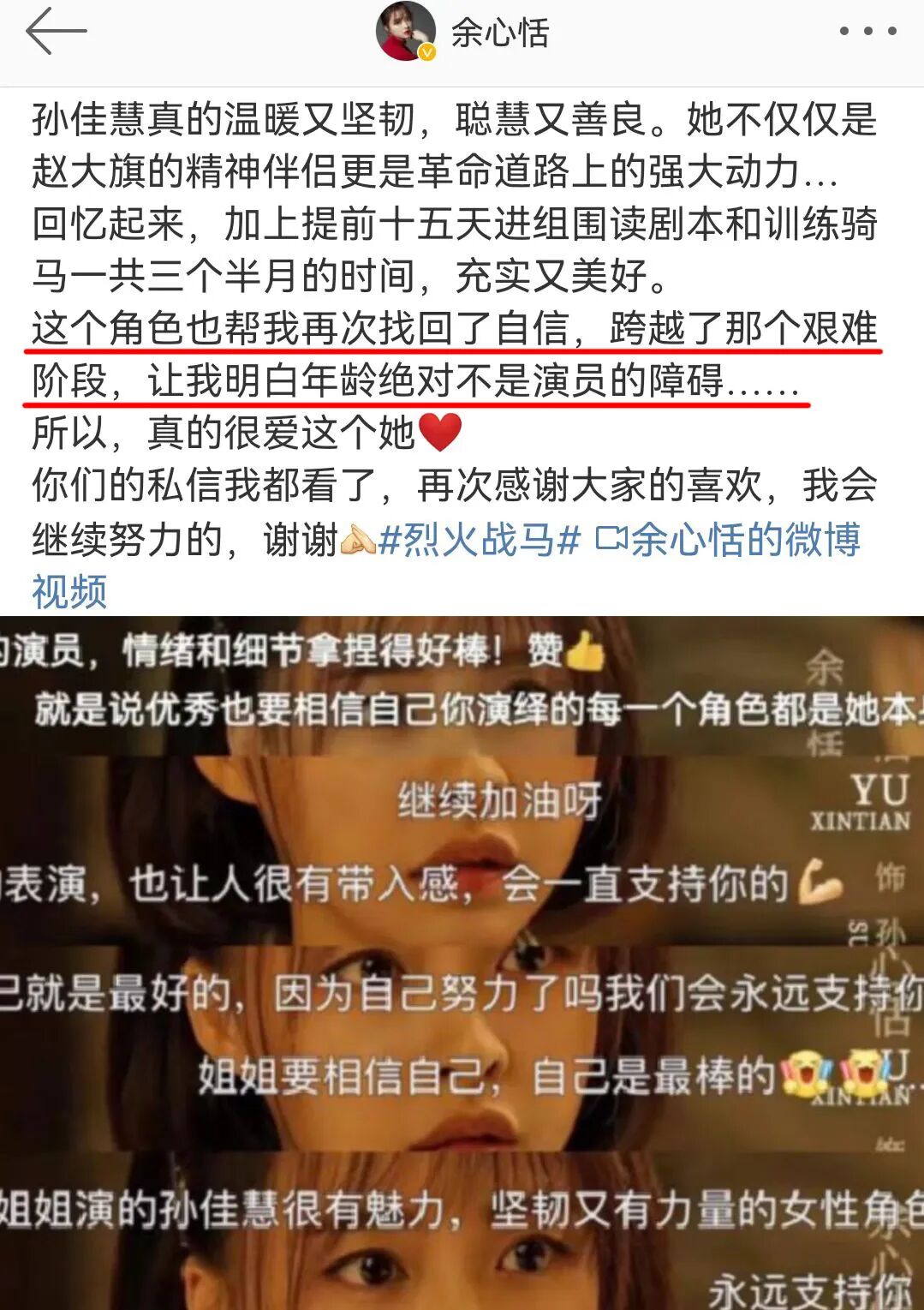 刚刚收官的抗战剧《烈火战马》就是在余心恬29岁时候拍摄的。她表示其实起初去试镜时,只是抱着试试看的心态,觉得尽人事听天命,做好自己就好。出乎她意料的是,从见组试镜到定下角色,一切都非常顺利。用吴樾导演的话说他不是想找人来演“孙佳慧”,而是想找到那个“孙佳慧”。也许恰恰是余心恬这几年的“宁缺毋滥”和沉淀,没有像很多年轻演员那样急于求成的去迎合市场,反而让更多这样高品质的剧看到她。