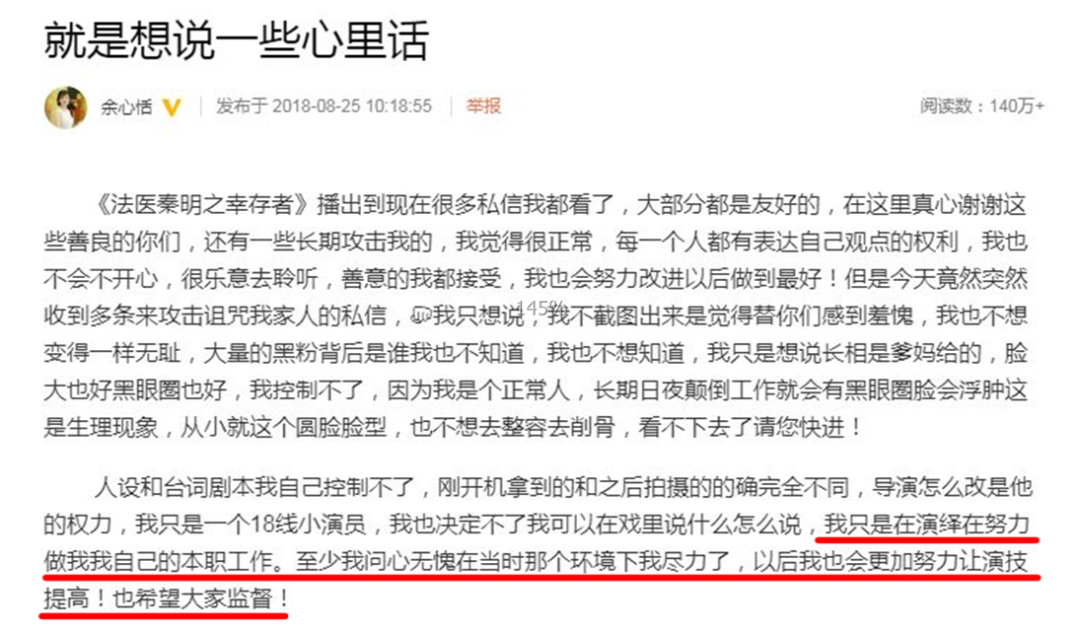 不过,一千个人眼中就有一千个哈姆雷特,陈诗羽也无法让所以观众都喜欢。加之余心恬易水肿的体质,本来是可爱挂的小圆脸上镜后显得更加肉肉,但这些外在的不好言论余心恬从来没放在心上,在她看来,演员出演的角色就是给观众评判的,那么好的坏的她都会坦然接受。不过,这并不代表她没有底线,当看到有人连带她的家人一起攻击,一向温和的余心恬也会勇敢站出来回击。
