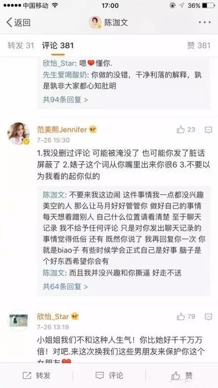 陈泇文直接在评论中嘲讽范美熙,故意炒作。