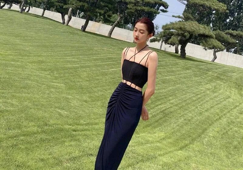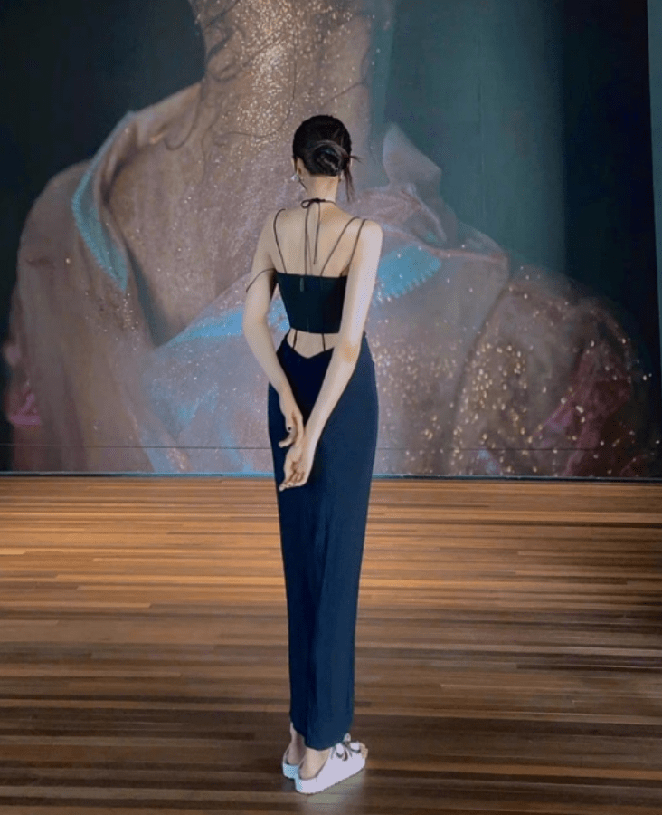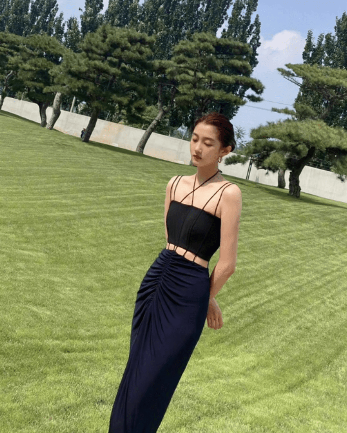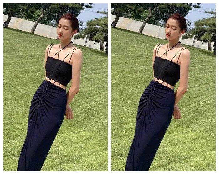 当我们选择同一色系的衣服时,层次感显得尤为重要。面料的不同,露肤的多少,版型设计的差异都可以为我们的穿搭增加亮点。而关晓彤选择紧身的短款黑色抹胸,搭配一件莫代尔面料的裹臀裙,颜色上相互呼应,款式上上短下长,十分轻松地甩掉路人感,穿出层次感。