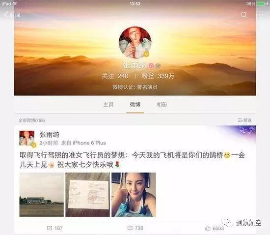 娱乐圈明星们乘坐私人飞机旅行,甚至是买飞机都已不再是稀罕事,刘涛、周杰伦、苗圃等都拥有属于自己的私人飞机。但较之明星圈里第一个拿飞行执照的苗圃,公众场合里各种光鲜性感的张雨绮也曾在微博上晒出自己取得的飞行驾照的照片,还写道“取得飞行驾照的准女飞行员的梦想:今天我的飞机将是你们的鹊桥一会儿天上见,祝大家七夕快乐哦”。真是一个集美貌与才华与一身的女子!