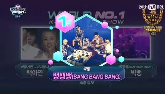 在6月25日晚间播出的Mnet音乐节目《M!Countdown》中,男团BIGBANG凭借歌曲《BANG BANG BANG》获得了冠军,打败了同为一位候补的歌手白娥娟。