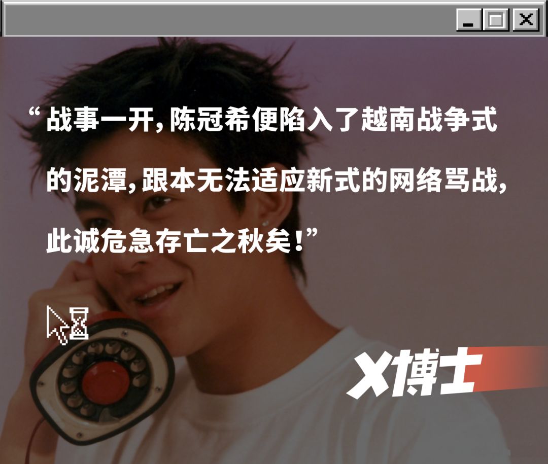 前些年,陈冠希年纪上了,火气不减,社交媒体上更是杀红了眼,看谁不爽就张口干谁。屡战屡胜,南伐林志玲,东征余文乐,西讨陈奕迅。对于交好的张震岳和热狗也不给面子,直喷他们参加垃圾节目。