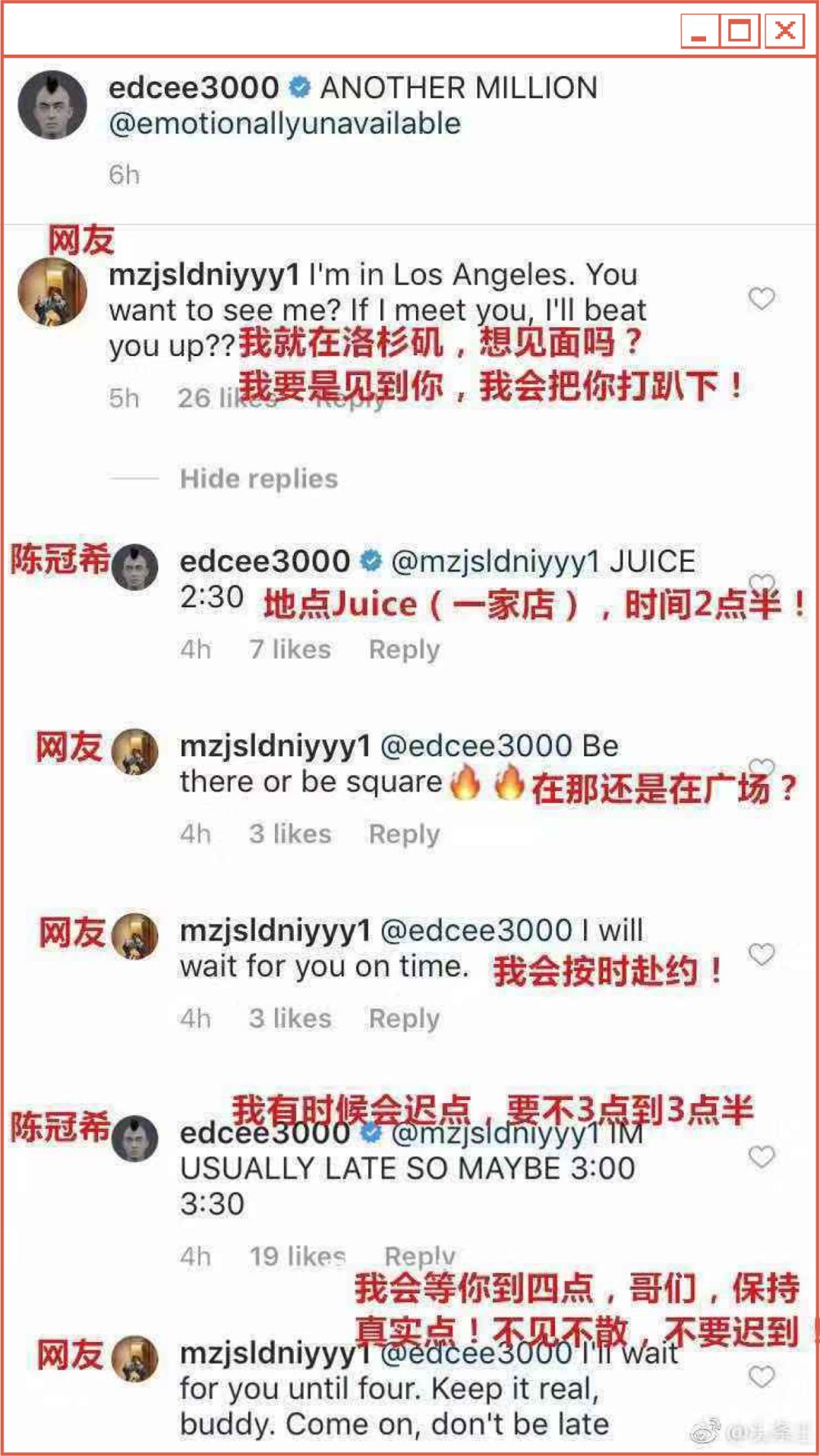 啥事呢?就是陈冠希最近跟孙笑川的粉丝打嘴仗,一个狗粉丝骗他要约架,一时间,评论区里的气氛剑拔弩张,感觉随时都要血溅洛杉矶街头。