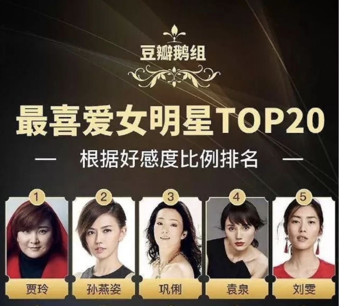 在豆瓣鹅组评选出的“最喜爱女明星TOP20”榜单里,她居然也夺了第一。