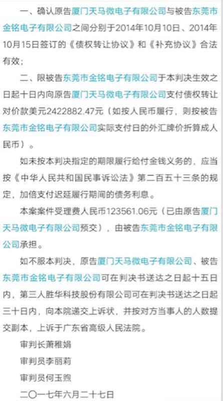 2017年6月27日法院判决金铭电子向厦门天马微电子支付债权转让对价款242.288247万美元(约人民币1530万元)。
