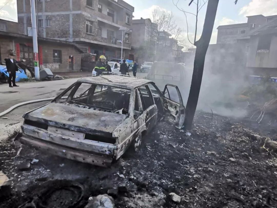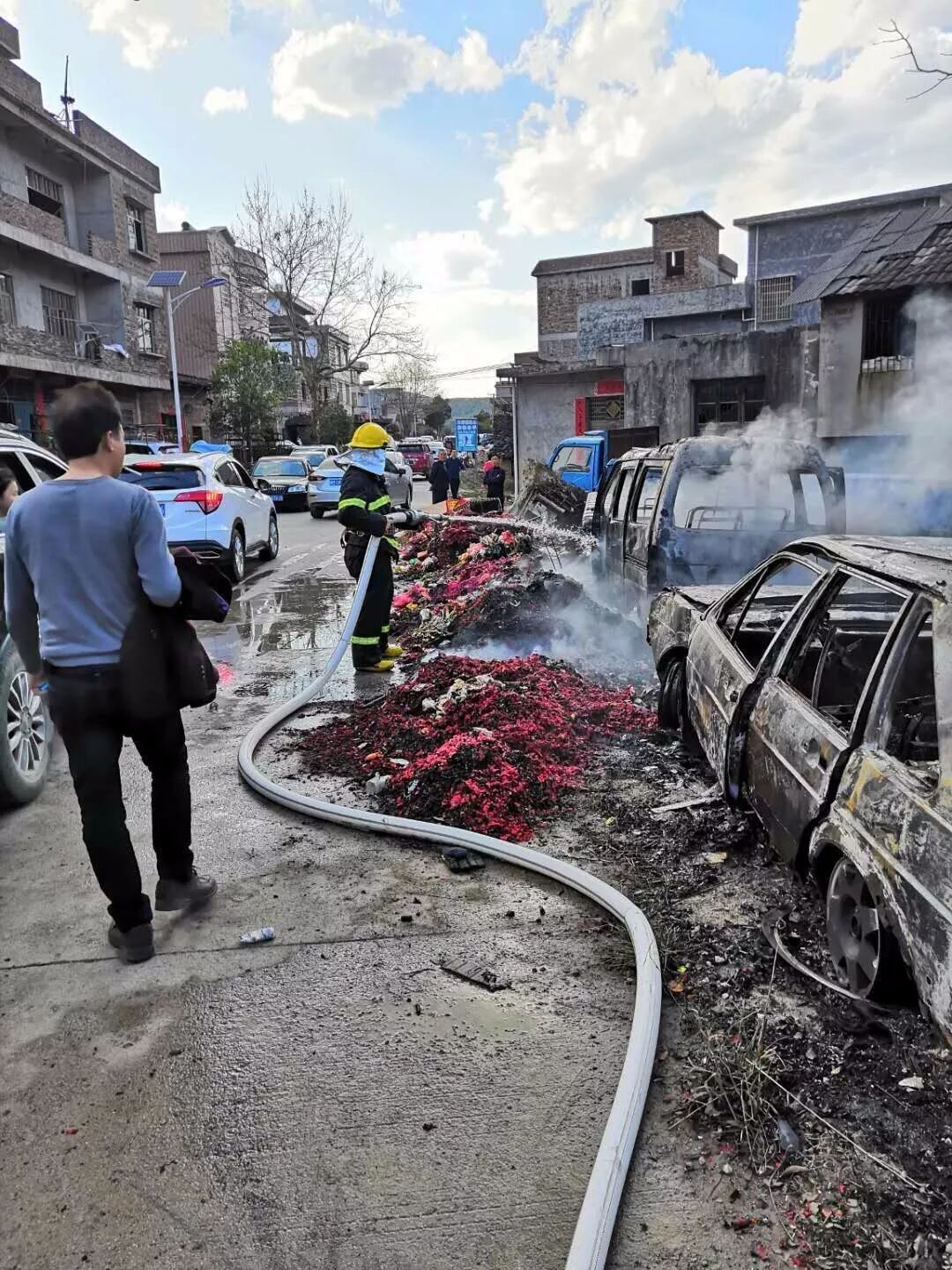据网友爆料:宁远县水市镇路边车辆被毁,因地上残留的鞭炮纸未燃尽,把小轿车的轮胎引燃起火最终造成车辆被大火烧毁!
