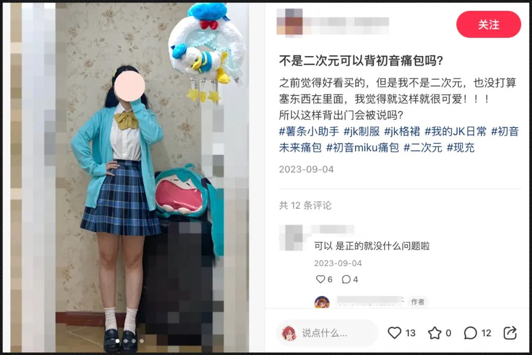 有段时间小红书上也有很多类似“不是Miku粉丝可以买这个痛包吗?”“不是二次元可以买吗?”的推文。我的评价也是:钱是自己支配的,是正品就好。