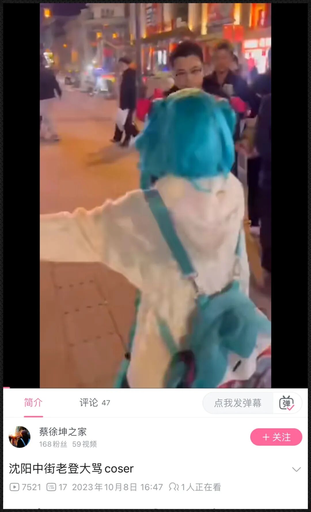 巧合的是,视频播完B站又自动推荐了另一段标题叫《沈阳中街老登大骂coser》的手机录拍,事情发生在去年十一,也有背着大嘴包的Coser出镜。