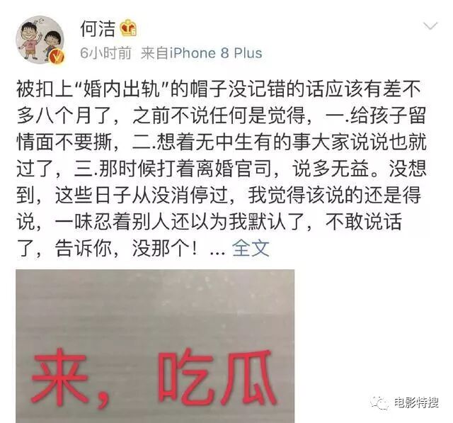 离婚时舆论一边倒,大家都在讨伐赫子铭,他发公告称自己是被离婚的,而且写到:“我收到一条微博私信,说因为何洁的介入导致他姐姐婚姻破裂,我才明白她坚决离婚的原因。”这句话信息量很大,何洁不仅自己婚内出轨,还介入别人婚姻当小三?