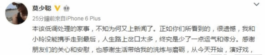 莫少聪在受访中大方澄清,与孙芸玲并没有离婚,更表示如今生活幸福。他解释2016年因为夫妻俩为生活的琐碎一度闹得不开心,一时间就说了气话,所以才写下了“未能携手走到最后”这样的字眼,不过后来双方心平气和地讲和了,并且很努力地学习适应彼此,学习相处,最终令夫妻关系得以延续,如今一家三口生活安好。令人好奇的是,既然没有离婚,为什么这么多年来莫少聪又从不澄清呢?直到“被离婚”7年后,他才说出了真相。