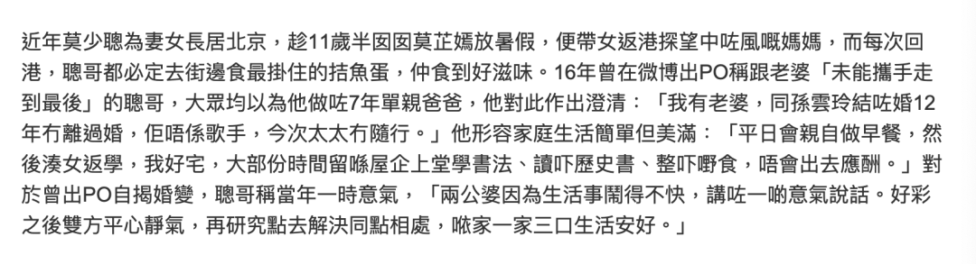 父女俩感情很好,一路有说有笑,莫少聪充当导游,四处为女儿指路,虽然他也很久没有返回香港,但是对香港一点都不陌生。不过父女俩身边并没有看到孙芸玲,本来这也不意外,因为莫少聪在2016年的时候曾经在社交平台公开表示,与孙芸玲未能携手走到最后,所以外界早就认为两人已经离婚。事实上,这么多年来也的确从未看到夫妻同框,只看到莫少聪与女儿,所以大家都以为莫少聪是单亲父亲,独力抚养女儿成长。不过实际上,莫少聪与孙芸玲根本就没有离婚,此次他返回香港罕有地受访,澄清与孙芸玲并没有离婚,两人结婚12年依然保持着婚姻的关系,一家三口的生活很幸福。