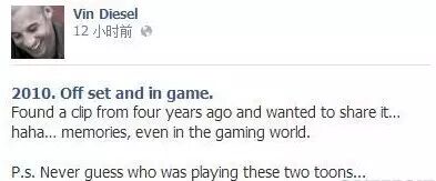 2014年,范·迪塞尔在Facebook上放出了一段他之前的《魔兽世界》游戏视频,让无数粉丝唏嘘不已。因为在这段2010年的游戏视频里,和范·迪塞尔一起奔跑在塔纳利斯沙漠上的不是别人,正是因车祸去世的演员保罗·沃克。