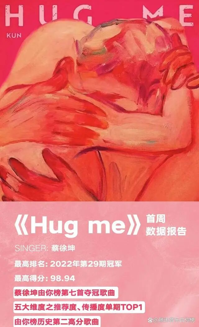 恭喜蔡徐坤新歌《Hug me》首次拿下腾讯音乐由你榜宝座!这是蔡徐坤在由你榜的第7首夺冠曲、也是他的第9次夺冠,以98.94的最高新歌综合得分不仅成为2022年得分最高歌曲,同时也跃升为由你榜历史第二高分歌曲!