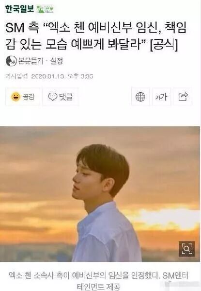 同时SM娱乐方面相关人士也表示:"EXO CHEN的准新娘确实怀孕了。但是,由于CHEN的准新娘不是艺人,所以很难公开她的月数和预定日期等具体内容,希望大家谅解。"