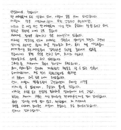 今天EXO的成员金钟大发了一封手写信。