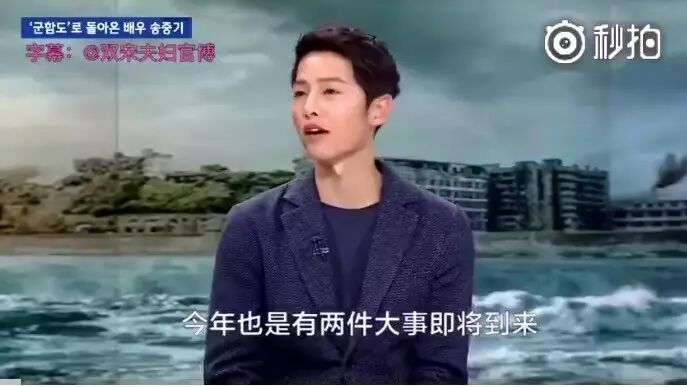 宋仲基在接受新闻采访的时候,直接说:“今年有两件大事,一件是电影《军舰岛》的上映,另一件是与宋慧乔结婚。”