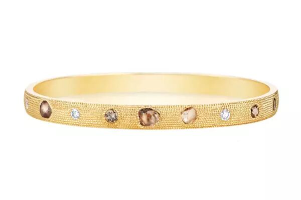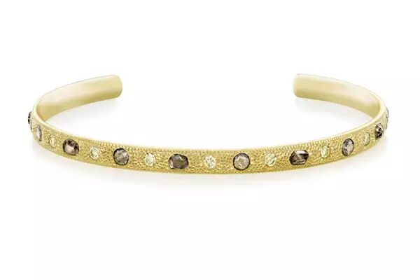 在这件宣言单品中,因其光彩和生命力而被精心挑选的抛光钻石,在不假纹饰的天然原钻之中翩翩起舞。专家们手工挑选每一颗天然原钻,每颗入选钻石都具有独特的美丽、鲜亮的色泽、柔和的形状和天然的亮度。在18K 黄金手镯上,白色和炫彩抛光钻石(圆形明亮型车工和古典玫瑰车工)及天然原钻在De Beers 独有的serti poincon(标志性)底座中散发出璀璨的光芒。总克拉数:1.30。