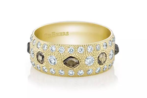 De Beers Talisman 系列18K 黄金戒环。黄金戒环与美丽的白色和炫彩天然原钻及抛光(圆形明亮型车工和古典玫瑰车工)钻石共同演绎原始护身符的极致高雅。总克拉数:2.15。De Beers 独有的serti poincon(标志性)底座。宽度8 mm。