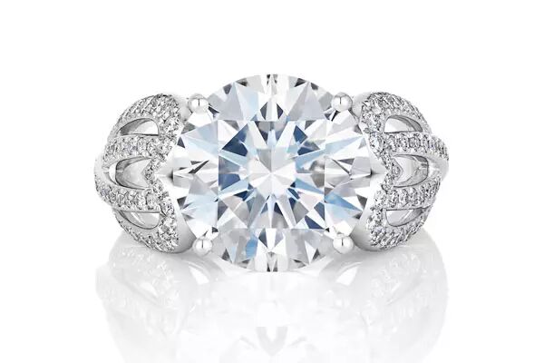 钻戒采用四爪镶嵌,突出中央主钻5克拉DIF罕有的明亮度,火光与生命力。整件作品全钻闪烁通透,时尚耀眼。