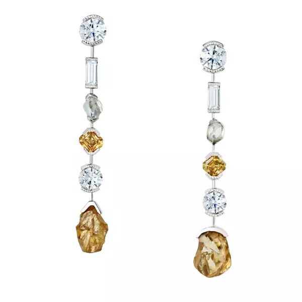 这款高级珠宝耳环镶嵌专家手工甄选美钻,并将其巧妙排列,布局完美。具有独一无二形状的天然原钻半包镶于底座中,开放式的底座使得光线从各个角度投入钻石中,于肌肤上散发出无限迷人的光芒。