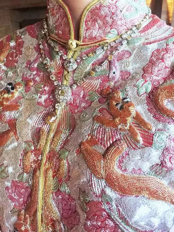 20日是传统的中式迎亲仪式,浩浩荡荡的迎亲队伍一早便赶往迎亲现场。立体盘扣的潮绣龙凤裙将女主人公衬托的优雅端庄,精美的De Beers Talisman系列珠宝椭圆形手镯,护身符般的18K黄金戒环,巧妙排列的高级珠宝耳环以及错落有致的高级珠宝项链衬托出刘诗诗轻柔典雅的气质。一切就绪,女主人公静待四爷敲响幸福的大门。