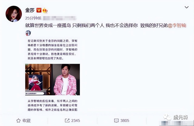 2020年,在金莎凭借《乘风破浪的姐姐》这档节目翻红后,李智楠在接受采访的时候,再次透露出了他对金莎的心意。