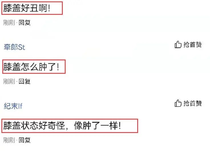 我以为网友的注意力会放在江疏影的穿衣搭配上。结果,大部分网友的注意力都在江疏影的膝盖上。有网友在评论区留言“膝盖的状态好奇怪,像赢了一样”,还有网友在评论区留言“膝盖怎么肿了”,甚至还有网友说“膝盖好丑”。可见网友们都觉得江疏影膝盖的状态很奇怪。