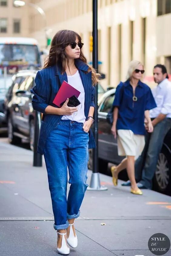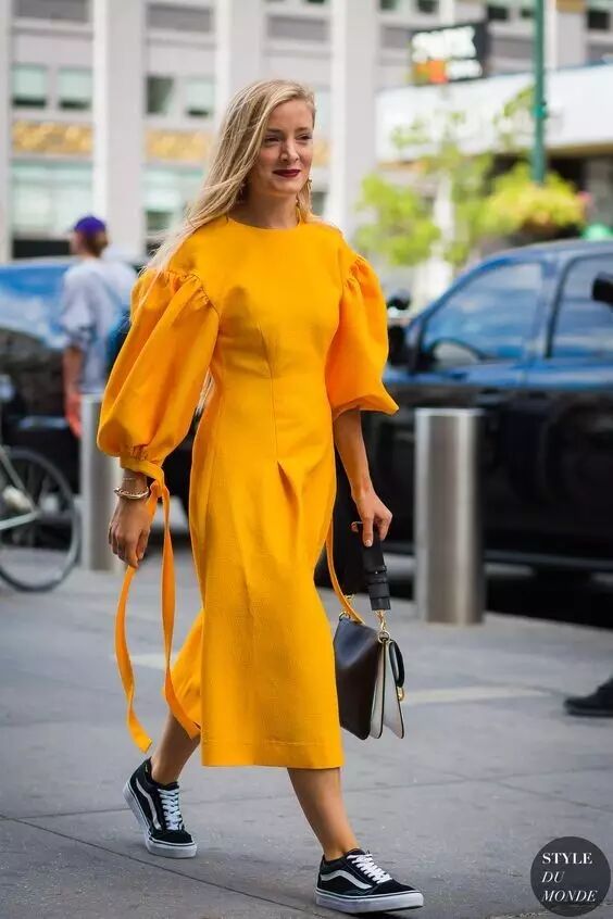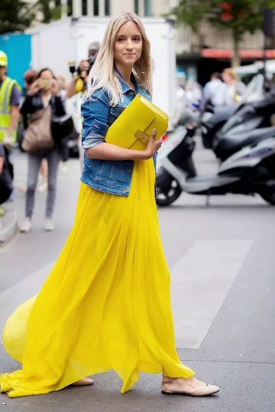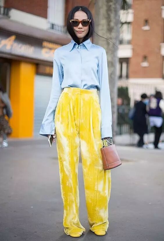 没有十足的勇气一身黄,那就借助其他颜色来中和鲜艳的色彩,既不会让整个人看起来黄得blingbling的,也点缀了整体造型。那么蓝色和白色便是黄色的最佳partner。