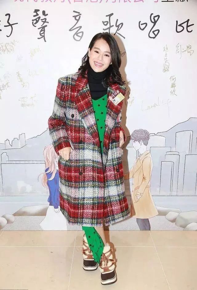 确实,这套红格子外套,里面搭了件绿色的长裙,红配绿,也是够了,关键是裙摆还不规则,露出来真心嫌丑!还有这双像圣诞老爷爷的靴子,一身搭配臃肿无比!
