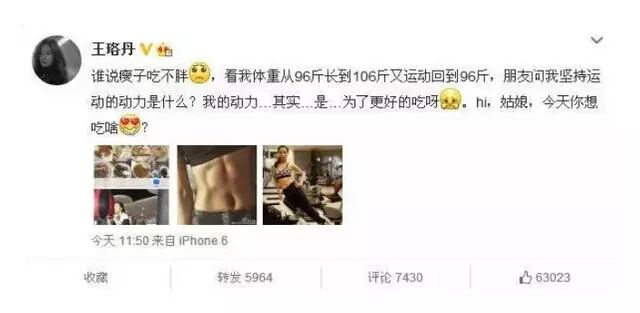 对于胖一斤都能被人揭穿的王珞丹而言,好好生活的标准就是好好吃,好好健身。好的身材,从来不是天生的,都是大家后天坚持努力得来的,没有谁比谁更有捷径可以走。想要有好身材的我们,也快快加入健身大军中,坚持健身吧!