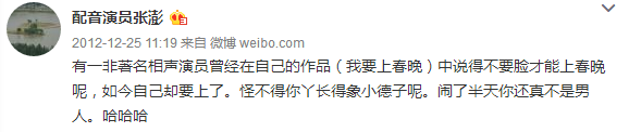 保剑锋微博说不认识张澎,可张澎曾为保剑锋配过音是事实。如今,张澎的抨击保剑锋的微博已经删除,但找到张澎之前贴出来的视频,大家可以鉴定一下