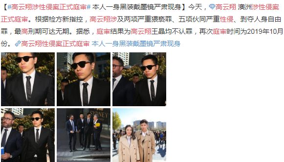 2019年1月25日,这则性侵案终于正式庭审,高云翔着黑西装戴墨镜现身。